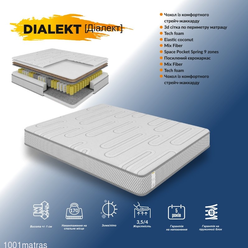 Матрас Диалект (Nikelly Dialekt) представляет собой идеальное сочетание современных технологий и традиционного комфорта, обеспечивая вам здоровый и полноценный сон каждую ночь. Насладитесь гармонией и расслаблением, доверившись качеству и удобству матраса Диалект (Nikelly Dialekt), который подарит вам ночи безмятежного сна и свежести каждое утро.