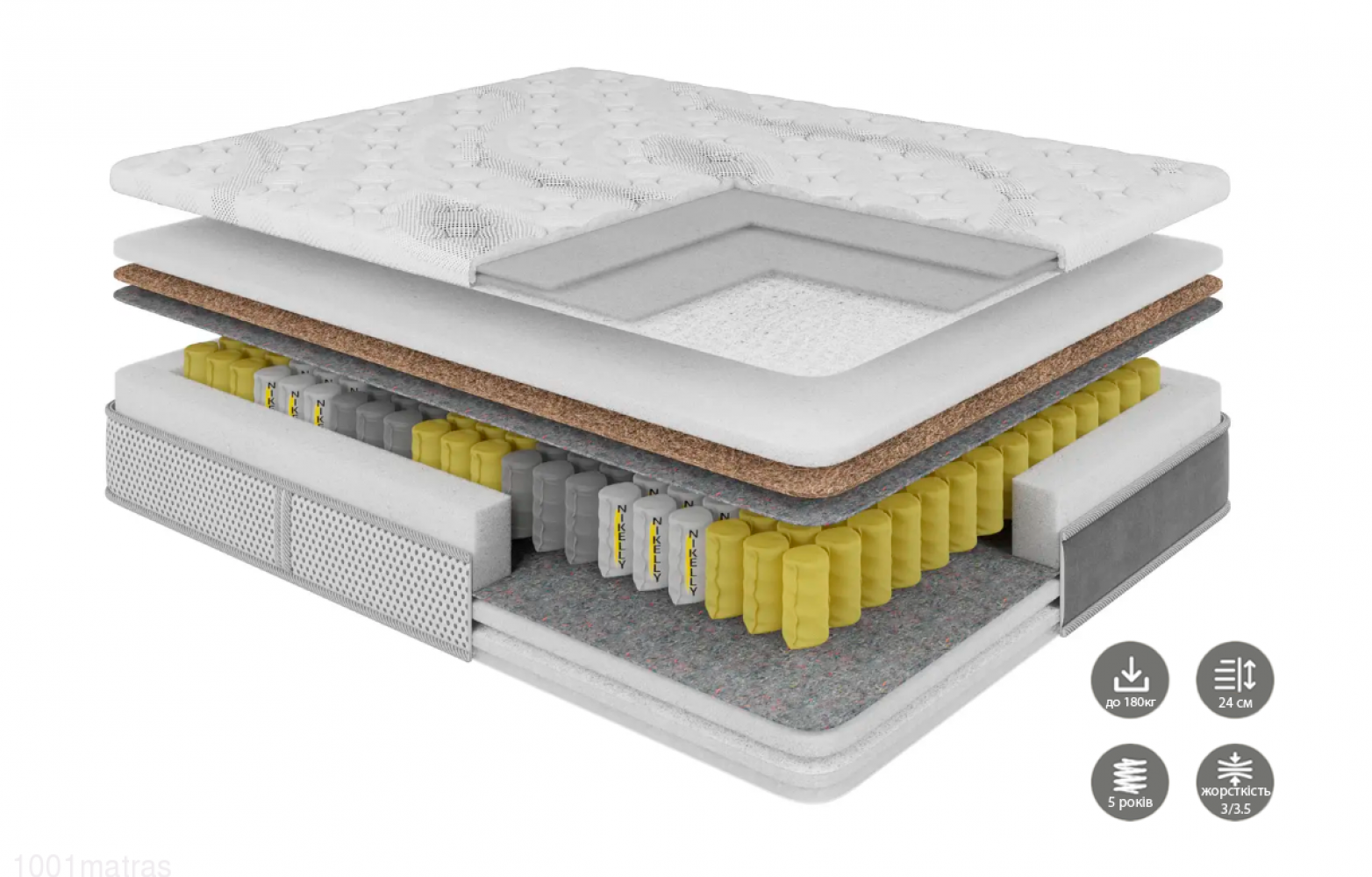 Non-woven fabric: Этот материал представляет собой плотный нетканый текстиль, который используется для улучшения структуры и прочности матраса. Non-woven fabric обеспечивает дополнительную защиту и поддержку для других слоев матраса.