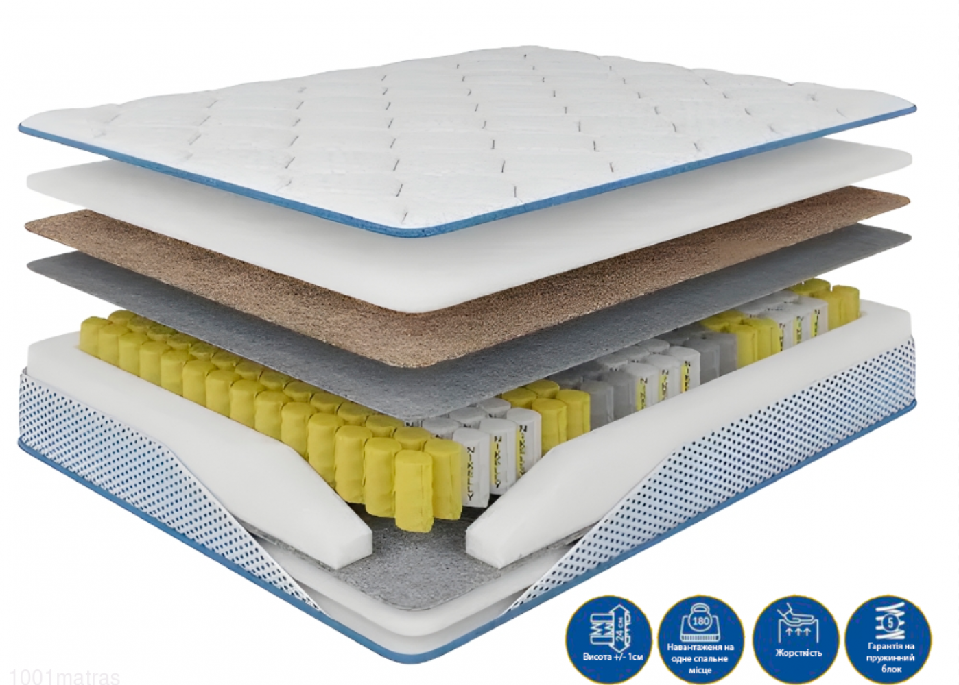 Mix Fiber: Это слой, состоящий из волокон джута, льна и бавовны. Этот материал обеспечивает повышенную износостойкость и защищает мягкие слои матраса от воздействия пружинного блока, при этом сохраняя анатомический эффект.